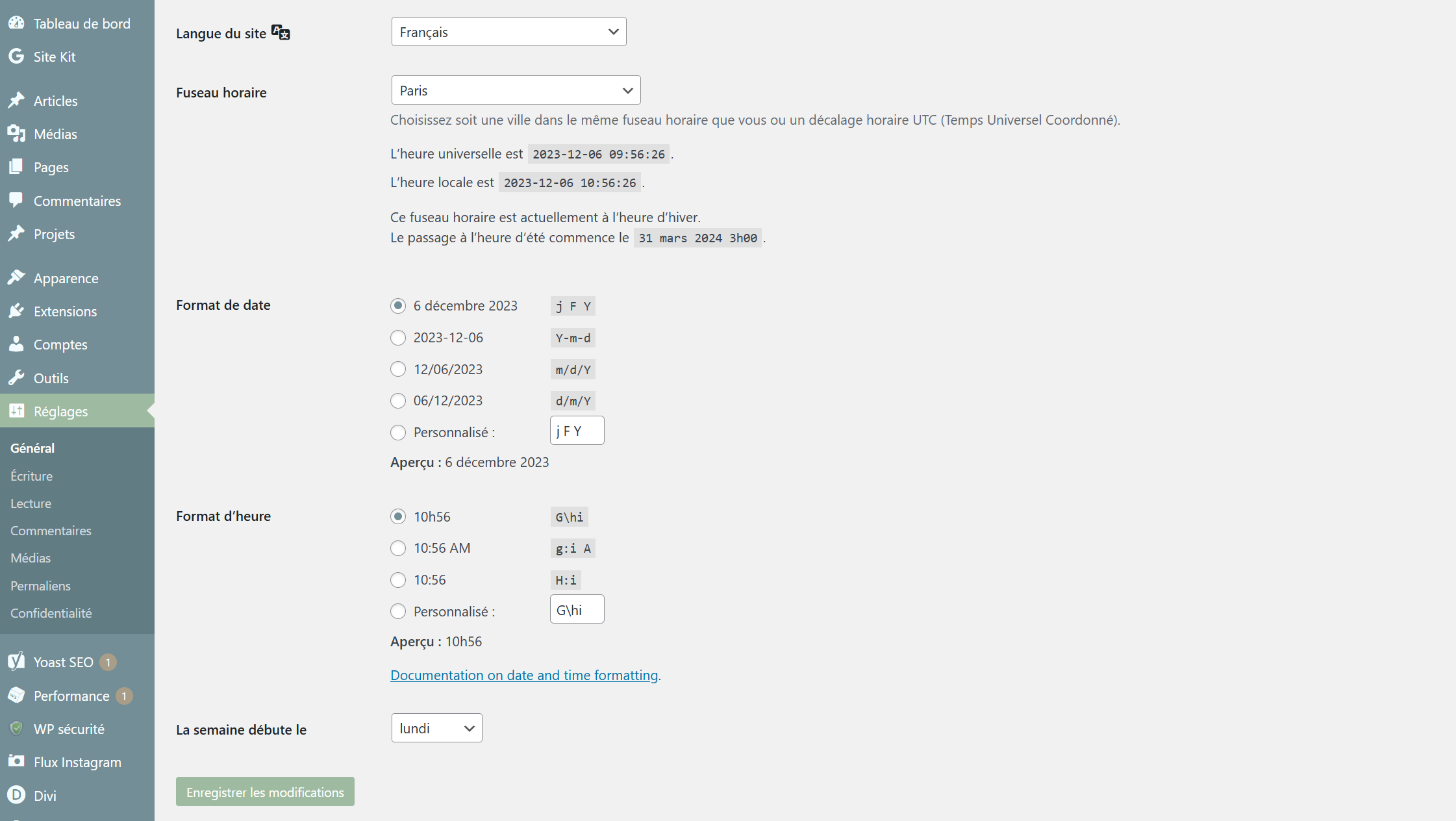 C’est dans cette même page que vous pourrez définir les paramètres de date : quel jour est le premier de la semaine, quel est le format de l’heure, quel est le format de la date.