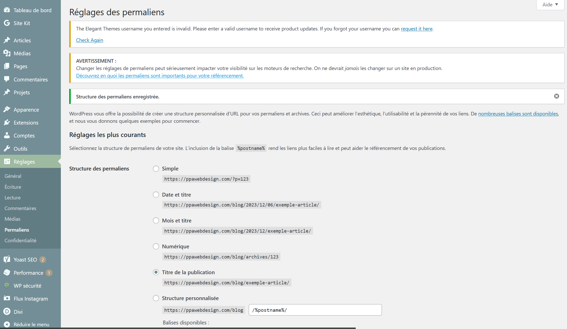 Les réglages des permaliens peuvent avoir un impact sur le fonctionnement du site (certaines extensions utilisées sont incompatibles avec certains formats).
